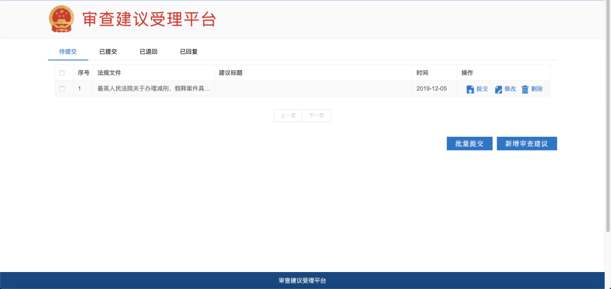 We then “saved” [保存] our blank comment and were directed to the following list (Fig. 6). It appears that a user’s suggestions for review will be grouped into those “pending submission,” “submitted,” “rejected,” and “replied.” On this page, you can submit, edit, or delete comments either one by one or in bulk, and can also choose to submit a new request (by going back to the very first page).