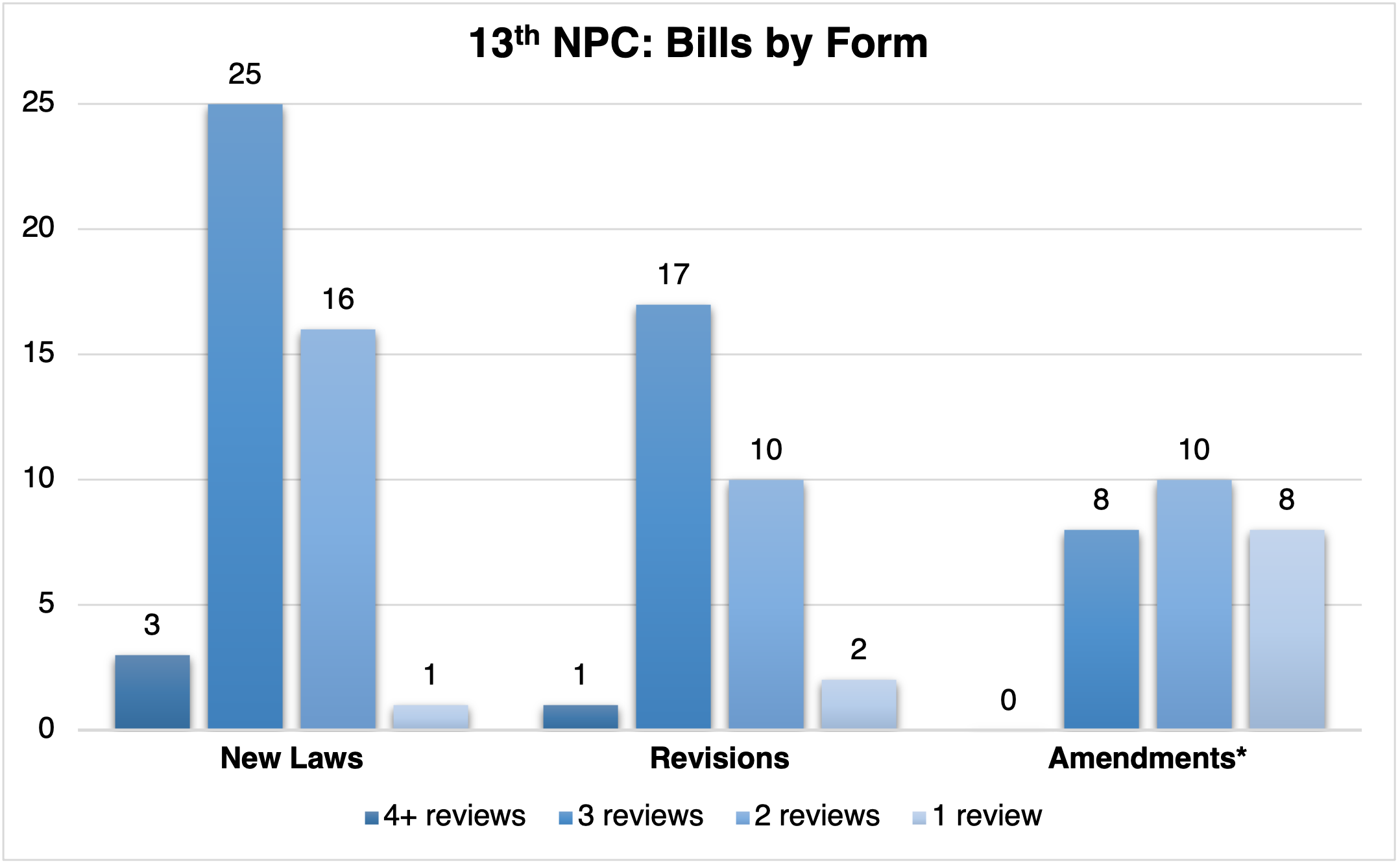 ➡️ The 13th NPC, in addition, passed 35 bills to amend 83 (non-unique) laws. Amendments are a much more versatile way to update laws, and the ones from last term varied greatly in scope.