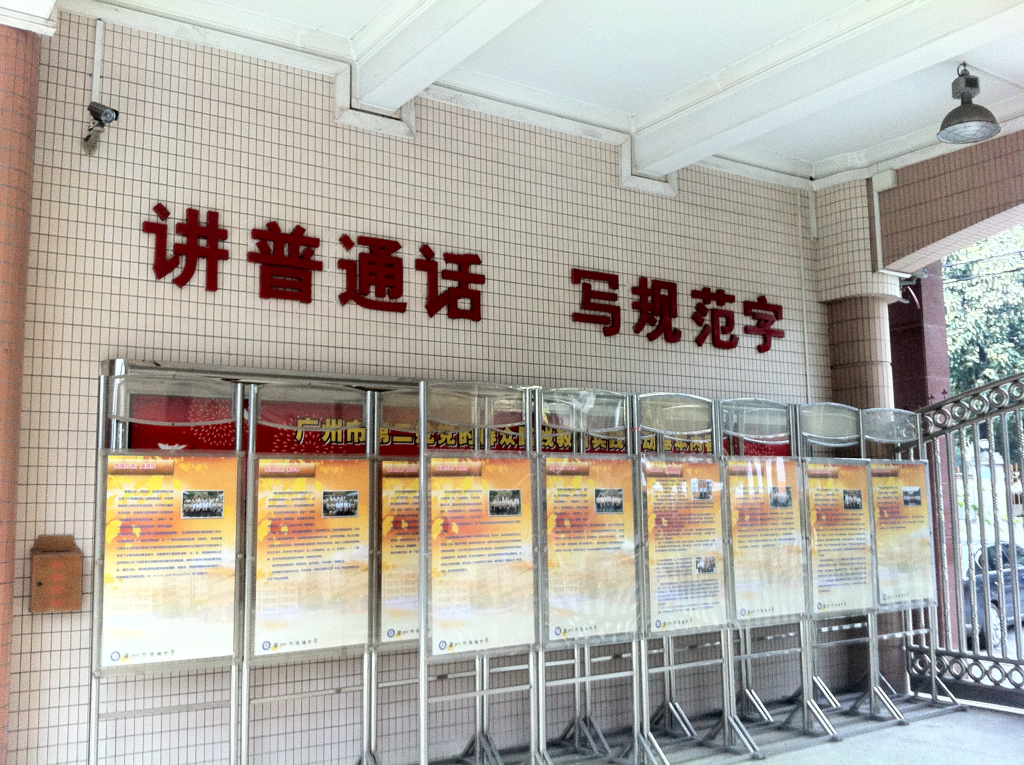 A slogan reading “Speak Putonghua, Write Standard Characters” in a Guangzhou secondary school. Photo by Gzdavidwong (Wikimedia Commons). CC BY-SA 3.0.